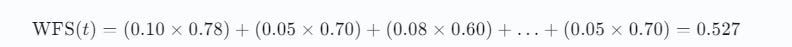 \( WFS(t) = \sum_{i=1}^{14} \omega_i \cdot \hat{M}^i(t) \)Example Calculation:
