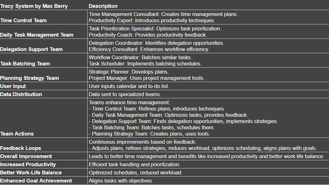 Expert Teams: The Tracy Team System is powered by 14 specialized teams of 3 experts each (totaling 42 experts), focused on different areas like time control, decision-making, planning, and personal development.