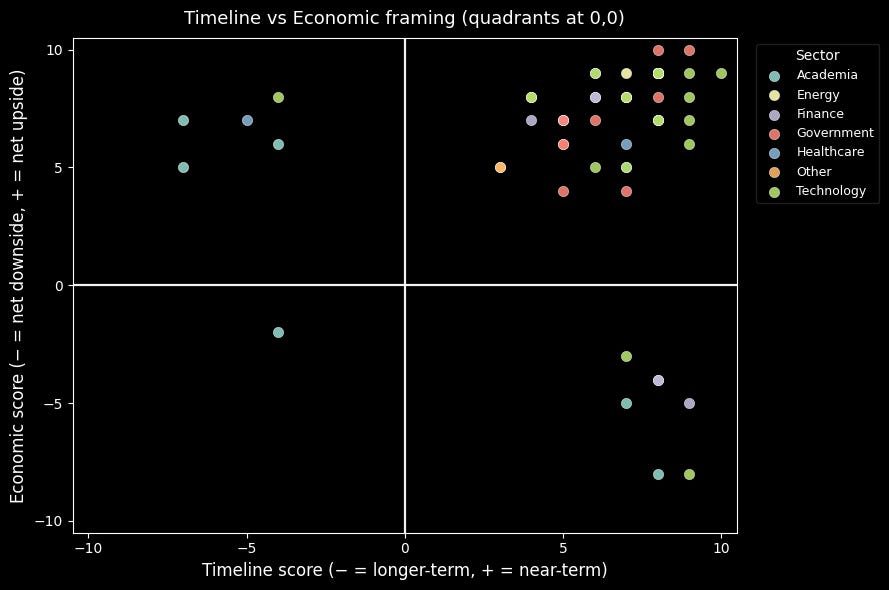 The data reflects this shift. Speakers clustered around two priorities: accelerating deployment and preserving system stability. Both camps accept AI’s transformative role in the economy; they diverge on timing, safeguards, and acceptable cost.
